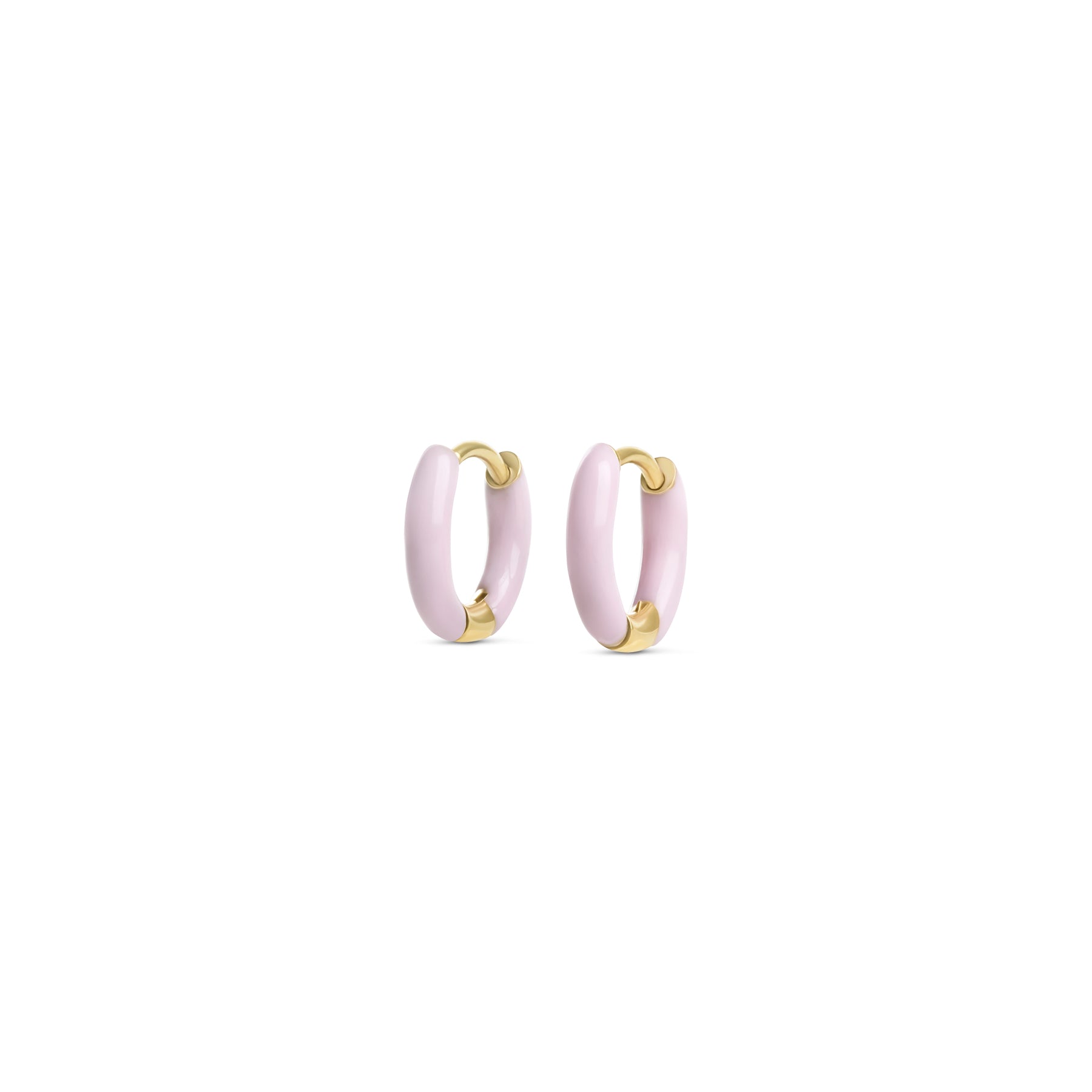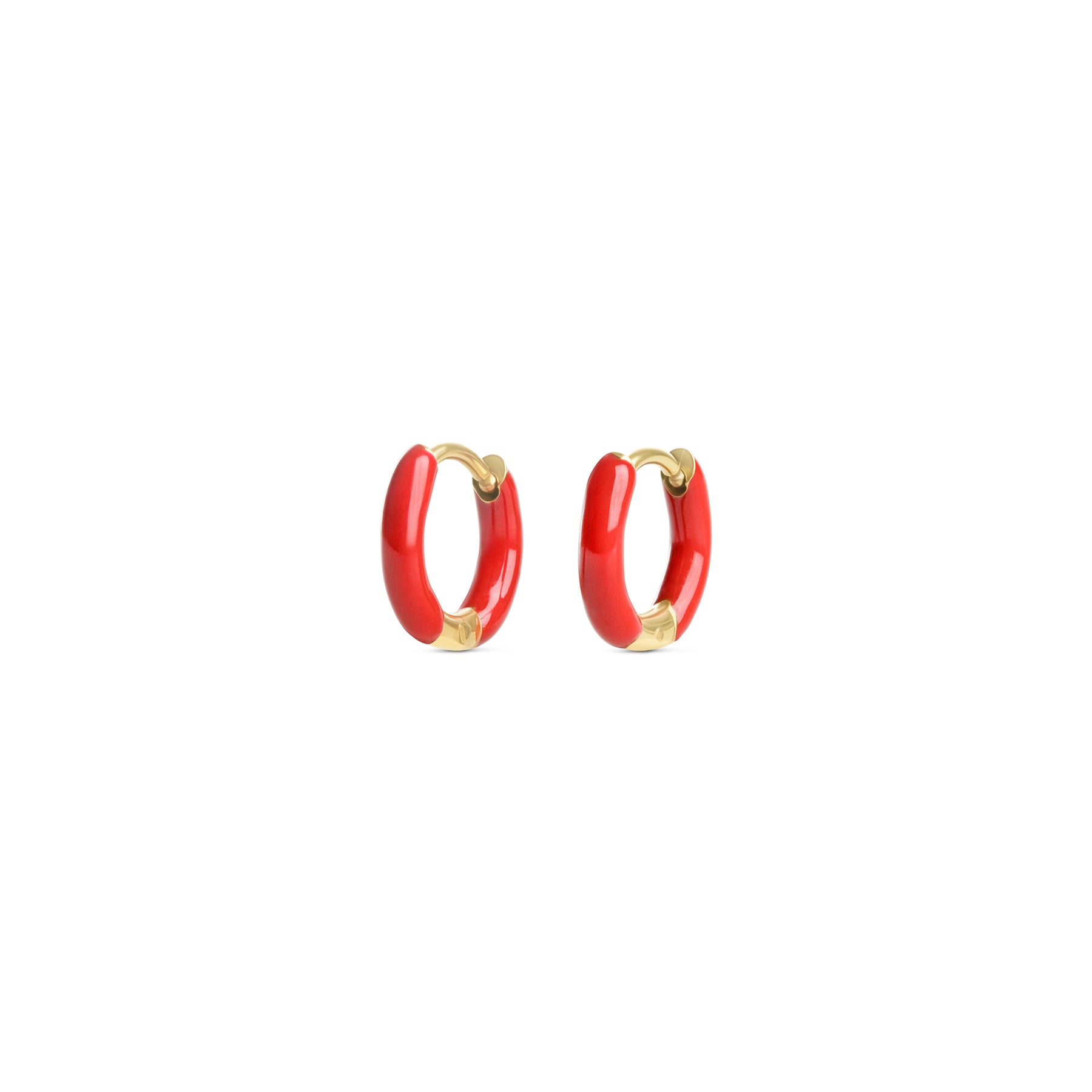 Classic huggie hoop earrings in waterproof stainless steel with a sleek fit, wrapped in colorful enamel. Comes in pink, white, blue or red.